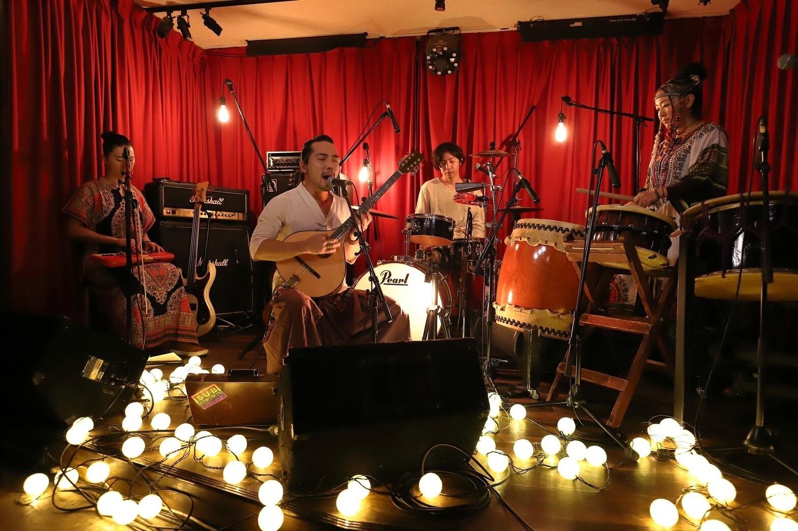 オリジナルの言語による歌と異彩な和太鼓が大陸的音楽を奏でる。